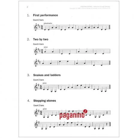 Stepping Stones bildet den ersten Band der Serie. Das Heft beinhaltet 26 einfache Stücke für Anfänger, die leere Saiten, den erste Finger und einfache Rhythmen vorstellen.