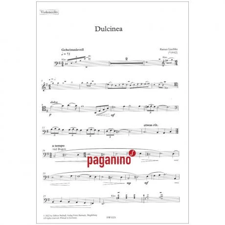 Der Titel der Fantasie Dulcinea hat zu der literarischen Figur einen nur losen Bezug. So wie sich Don Quijote in dem berühmten Roman von Cervantes seine Herzensdame als Dulcinea von Toboso nur erträumt, so sollen hier, auf musikalische Weise, die möglichen Sehnsüchte und Tagträume von Dulcinea erwogen werden. Das fröhliche kastilianische Lied »Límpiate con mi pañuelo« steht für erträumte Lebensfreude und soll mit motivischen Anklängen einen möglichst scharfen Kontrast zu den elegischen Passagen bilden. Das Stück ist auf »Youtube« hörbar.