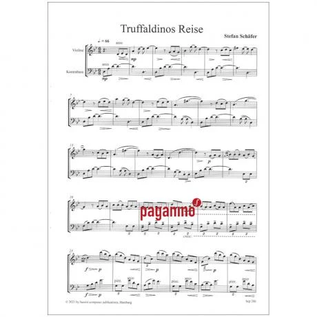 Smeraldina und Truffaldino hatten sich ja erst am Ende des unterhaltsamen Theaterstücks gefunden. Was auf der Reise danach passiert, bleibt der Fantasie von Spielern und Publikum überlassen … Das einsätzige Duo mit einem langsamen und schnellen Teil ist in mittlerem Schwierigkeitsgrad gehalten. Der Kontrabasspart geht bis zur 7. Lage.