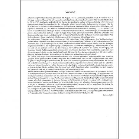 Johann Georg Christoph Schetky, geboren am 19. August 1737 in Darmstadt, gestorben am 30. November 1824 in Edinburg, wuchs am Hof zu Hessen-Darmstadt auf, wo sein Vater als Musiker und Sekretär im Dienste des Landgrafen Ludwig VIII stand. Schetky erhielt Kompositionsunterricht bei Johann Samuel Endler und Cellounterricht bei Anton Filtz. Später war er selbst Cellist in der Hofkapelle zu Darmstadt, ab 1768 wirkte er als frei konzertierender Cellist zunächst in Hamburg, 1772 in London. 1774 wurde er Erster Cellist der Edinburgh Musical Society und heiratete dort die Tochter des emigrierten österreichischen Cellisten Joseph Reinagle (1762-1836). Die Celloduette Op. 7 sind für den Unterricht gedacht und erschienen um 1780 im Londoner Verlag. Die Duette sind wegen ihrer ansprechenden Melodik und leichten Spielbarkeit hervorragend für den Unterricht geeignet. Beide Spieler erhalten dankbare Aufgaben, die dem Instrument ideal auf den Leib geschrieben sind.