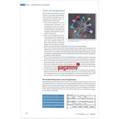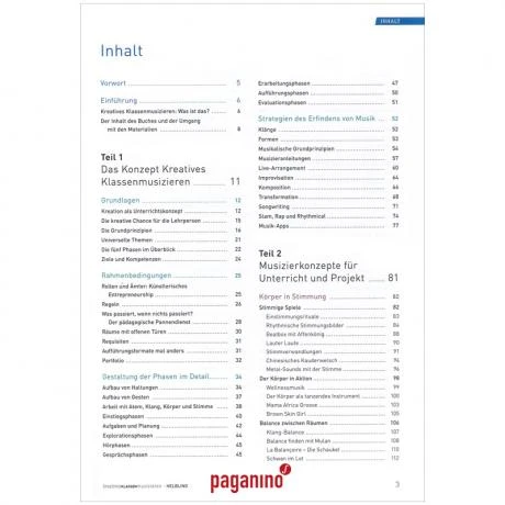 Der zweite Teil lädt mit 335 konkreten Ideen zu fantasievollen Kreationen ein, die beispielhaft zeigen, wie Kreatives Klassenmusizieren ganz praktisch im Unterricht umgesetzt werden kann. Diese Unterrichtseinheiten sind in vielfältige Themenbereiche aus der ganzen Welt des menschlichen Seins gegliedert: Im Kapitel »Stimmige Spiele« werden Metal-Sounds mit der Stimme imitiert; »Körper in Aktion« beschäftigt sich mit der Musik von Beyoncé zu aktuellen und überkommenen Körperbildern; das Kapitel »Fire!« stellt AC/DC und Mozarts Requiem zu einer Feuerperformance zusammen; das Kapitel »Flussrituale« nimmt Billie Eilishs Song »Ocean Eyes« zur Grundlage spannender Variationen, während sich in »Arabesquen: Musikalische Gewächse« alles um sich windende, nach oben strebende Formen in Musik und Kunst dreht; um nur ein paar wenige Beispiele zu geben. Unterstützt werden diese Unterrichtseinheiten durch 62 Kopiervorlagen, darunter 29 ausgewählte Arrangements aus dem Buch, mit denen die Klassen muszieren können.