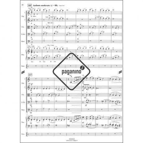 Orchesterbesetzung: (8) Violine I, (8) Violine 2, (4) Violine 3/Viola – Treble Clef, (4) Viola, (4) Cello, (4) Bass, (1) Piano, (2) Perkussion.